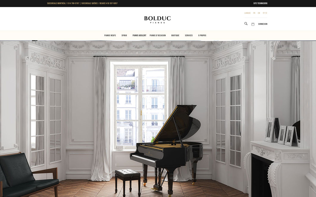 Pianos Bolduc, représentant exclusif des pianos Steinway & Sons, Boston et Essex, occupe le premier rang dans la vente au détail. L’entreprise possède une expertise unique dans la réparation et la restauration de pianos au Québec et à l’étranger.